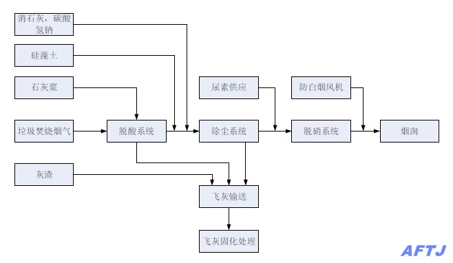 由垃圾焚燒產生的煙氣,首先經過脫酸系統,去除煙氣中包含的酸性氣體,在脫酸系統中加入石灰漿,作為原料,與氣體中的酸性物質中和從而達到脫酸的目的。然后加入消石灰,碳酸氫鈉,硅藻土等物質,進一步去除氣體中的酸性物質。其次,氣體進入到除塵系統,主要作用是去掉氣體中的灰塵;最后,氣體到達脫硝系統,脫硝系統由尿素產生氨氣,用來去除氣體中的氮氧化物。經處理后的氣體達到環保要求,經煙囪排出,其中防白煙風機會改變煙氣中的含水量,改變氣體排出后的視覺效果。