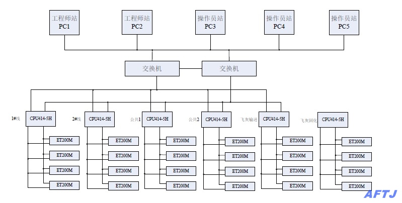 STEP7 V5.5進行設計,從功能上講共分為6部分,其中第1,2部分是兩條生產線,包含脫酸系統,除塵系統,脫硝系統,尿素制備系統;第3,4部分是公共部分,包含石灰漿制備,硅藻土制備,活性炭、碳酸氫鈉輸送系統等;第5部分是飛灰輸送,將氣體中的灰渣和鍋爐中的灰渣收集起來;第6部分是飛灰固化,將收集后的灰渣作固化處理,為填埋做好準備。