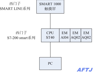 加濕自動化控制系統(tǒng)的硬件部分核心是西門子S7-200 smart系列PLC,采用CPU ST40,24V供電,晶體管輸出型號;擴展模塊使用1個EM AI04和2個EM AQ02共8路模擬量輸入輸出通道。觸摸屏選用西門子SMART LINE系列SMART 1000觸摸屏,為10.2寸。完整的控制系統(tǒng)組成如圖1所示: